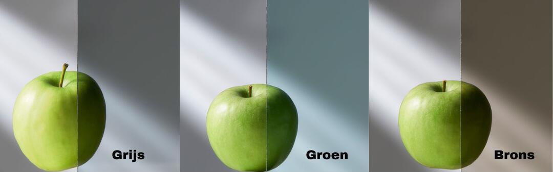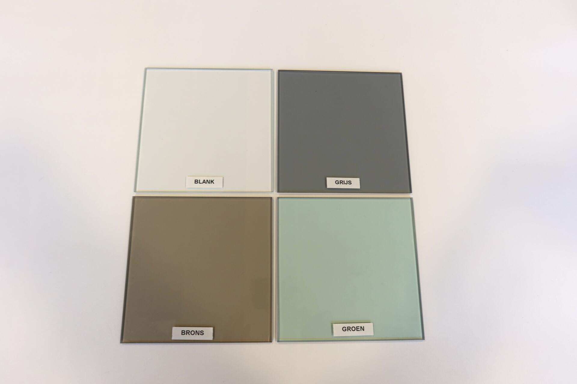 Gekleurd glas draagt bij aan een unieke uitstraling in ruimtes. Het is verkrijgbaar in verschillende tinten, waarvan wij groen, grijs en brons aanbieden.