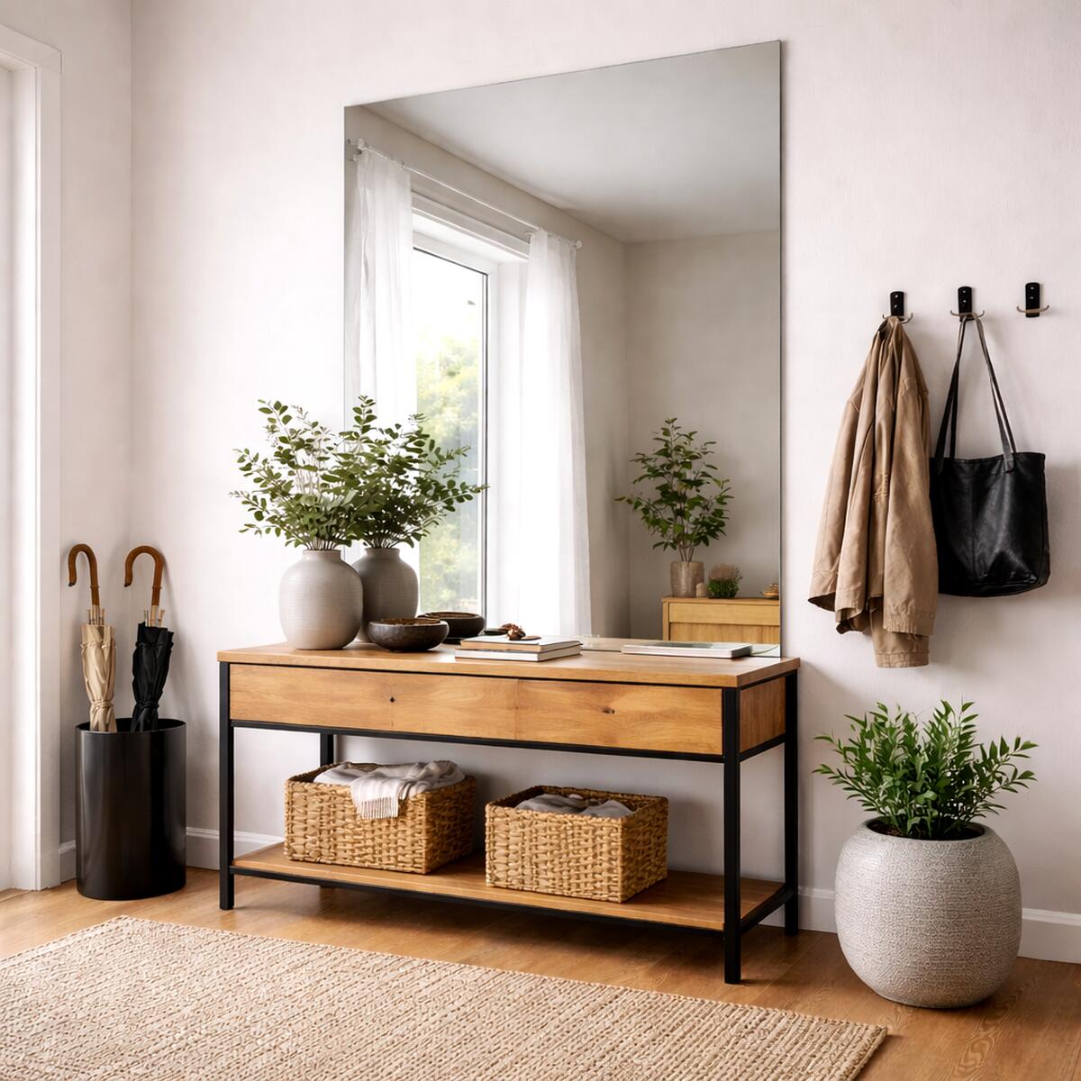 Een andere plaats voor deze spiegel is boven een tafel in de hal, waarbij het mes aan twee kanten snijdt. Je geeft je hal een stijlvolle uitstraling én creëert tegelijkertijd een praktische plek om je sleutels of post neer te leggen. Voor een lange lange, smalle hal kan een verticale spiegel helpen de ruimte optisch te hoger te laten lijken, terwijl een horizontale spiegel juist de breedte van de hal benadrukt.