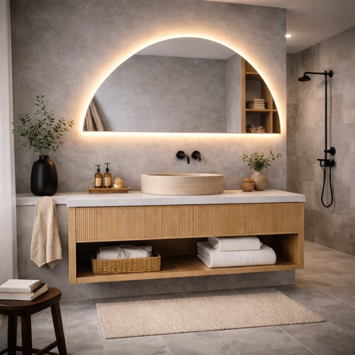 Je gebruikt een halfronde spiegel eenvoudig in verschillende ruimtes, zoals de badkamer, hal of slaapkamer. In een badkamer zorgt de verlichting voor functioneel licht, terwijl de vorm het geheel net wat zachter maakt dan een standaard rechthoekige spiegel. In een hal of slaapkamer voegt de spiegel juist sfeer en karakter toe.