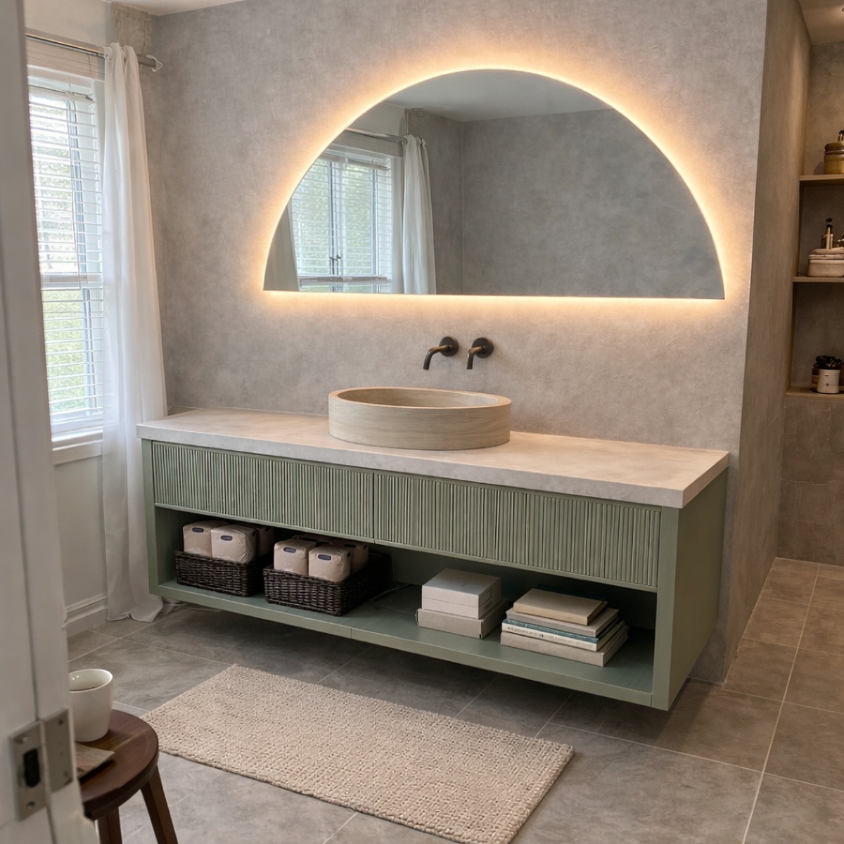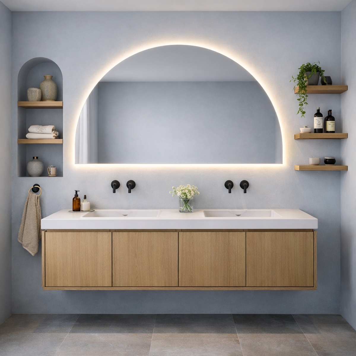Dit creëert een zachte, indirecte lichtlijn die prettig is voor de ogen. De verlichting is ideaal voor dagelijkse handelingen zoals scheren of make-up aanbrengen, maar draagt ook bij aan een rustige en sfeervolle uitstraling in de ruimte.