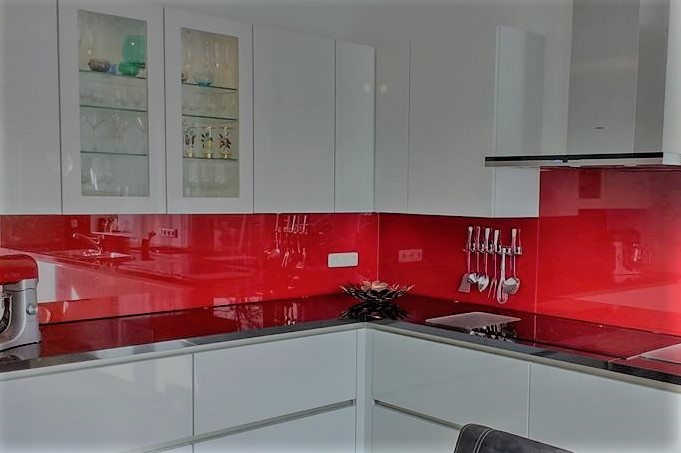 Keukenachterwand van gekleurd gelakt glas, de perfecte spatwand