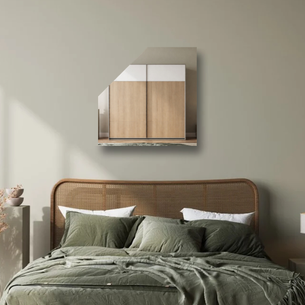 Een spiegel met een schuine zijde links aflopend is ideaal voor ruimtes met een schuin plafond of schuine wand, zoals zolderkamers, maatwerkkasten of ruimtes onder een trap. Door de schuine zijde kan de spiegel netjes aansluiten op de vorm van de ruimte, waardoor een strakke en verzorgde afwerking ontstaat.