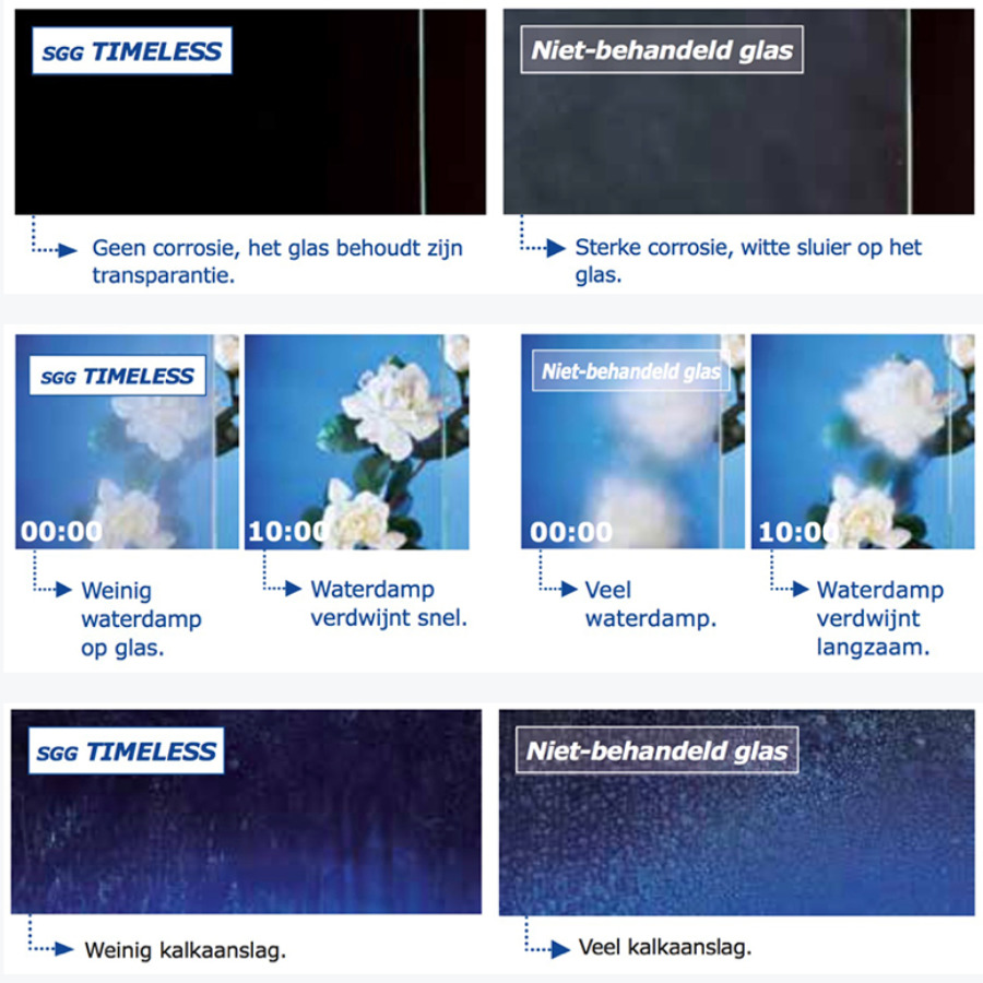 Met ons timeless gecoat geharde glas kies je voor blijvend transparant doorzicht van het glas. Het glas behoudt zijn heldere doorzicht doordat het dag in, dag uit wordt beschermd tegen vervuiling en kalk. Dankzij de duurzame coating glijdt water moeiteloos van het glasoppervlak, zonder vervelende kalkaanslag achter te laten. Bovendien is antikalk glas eenvoudig schoon te maken. Na het douchen veeg je met gemak de wisser over het glas, waardoor droog schoonmaken een fluitje van een cent is. Dankzij de timeless coating verdwijnt condensatie sneller, waardoor waterdamp makkelijker opdroogt dan op glas, zonder een antikalk coating.