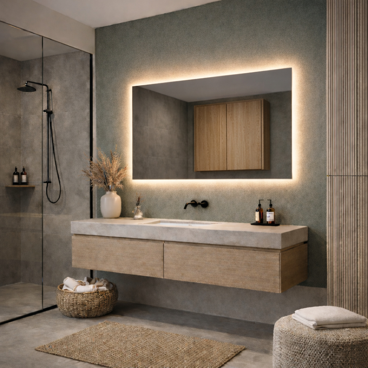 De geïntegreerde led-verlichting zorgt voor gelijkmatig licht rondom de spiegel. Dit maakt de spiegel ideaal voor dagelijks gebruik, zoals scheren, stylen of make-up aanbrengen. Tegelijkertijd creëert de verlichting een rustige en moderne uitstraling die bijdraagt aan de sfeer in de ruimte.