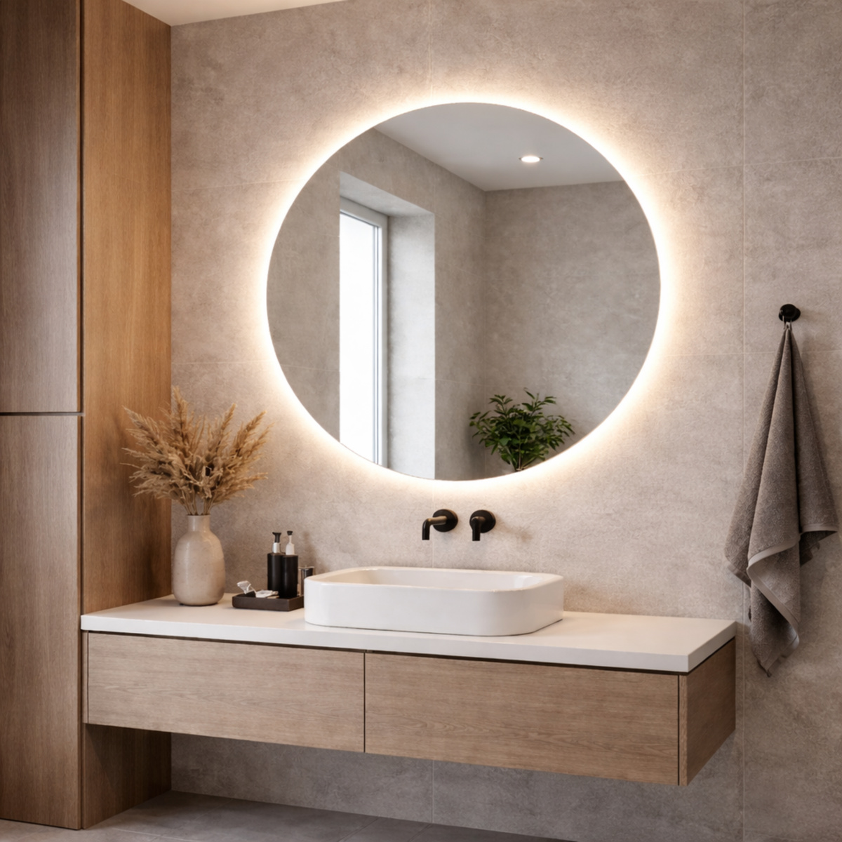 Een ronde spiegel met LED-verlichting biedt meerdere voordelen. De ronde vorm zorgt voor een zachte en moderne uitstraling en maakt de ruimte visueel minder strak. Dit zorgt voor een prettige balans, vooral in ruimtes met veel rechte lijnen.