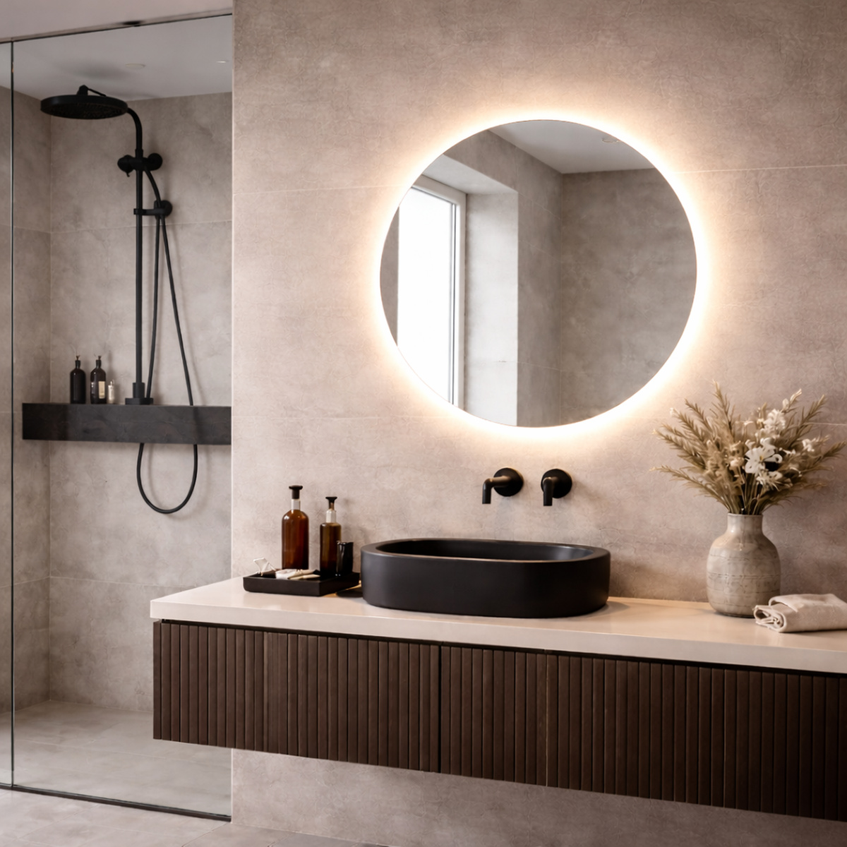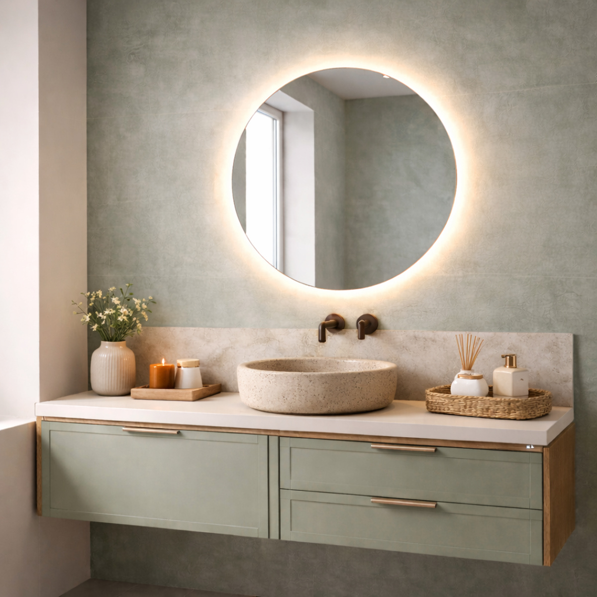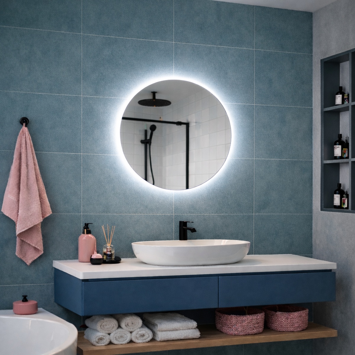 Het resultaat is een zachte, rustige lichtgloed die prettig is voor de ogen. De verlichting is geschikt voor zowel functioneel gebruik, zoals scheren of opmaken, als voor sfeerverlichting in de avond.