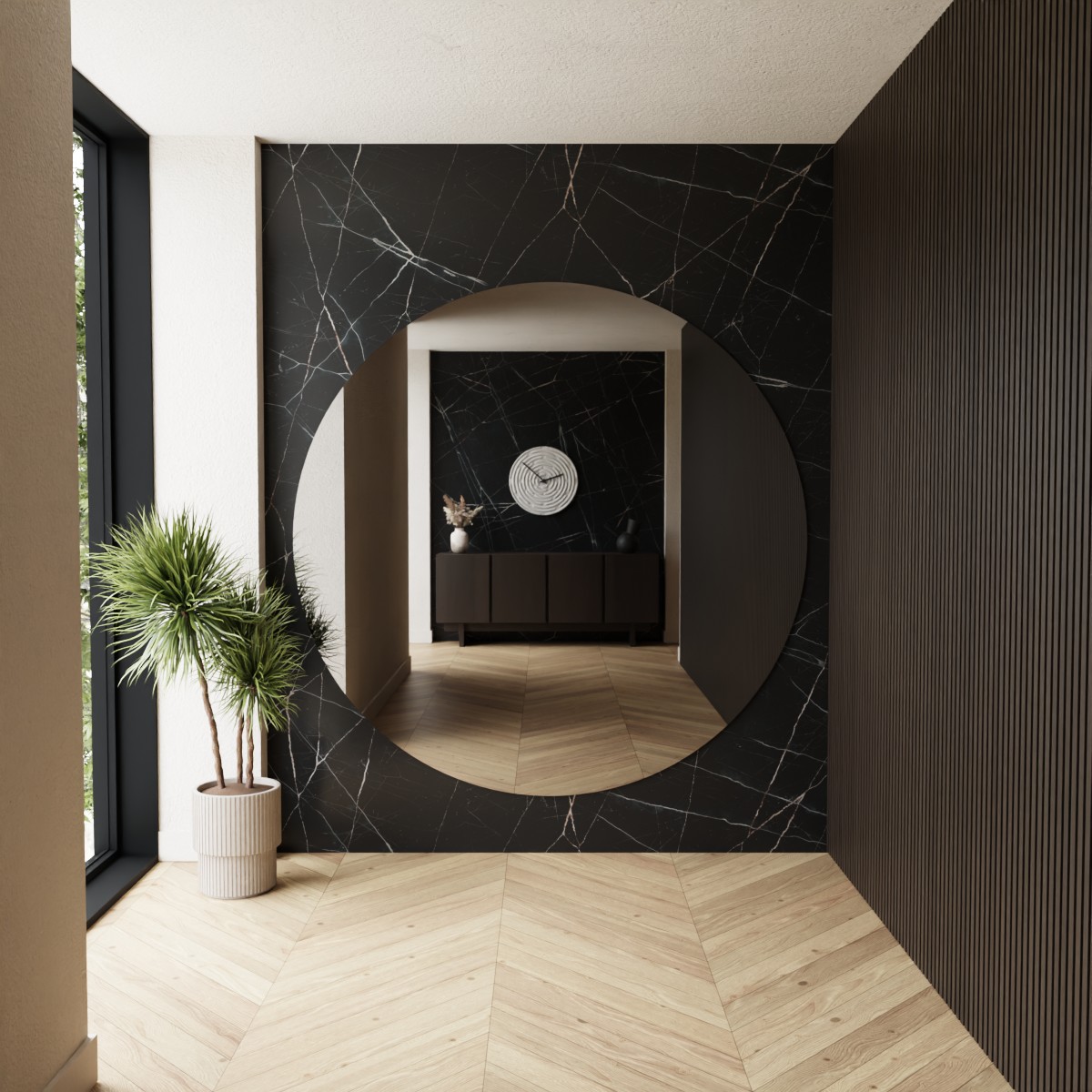 Bekijk hieronder hoe een grote ronde spiegel in brons er in de praktijk uitziet.