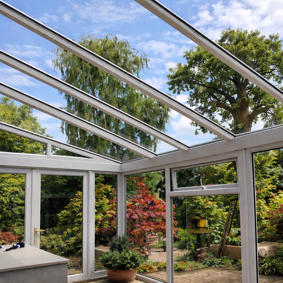 Met een glazen serre kun je ten alle tijde van je tuin genieten, ook bij slecht weer.