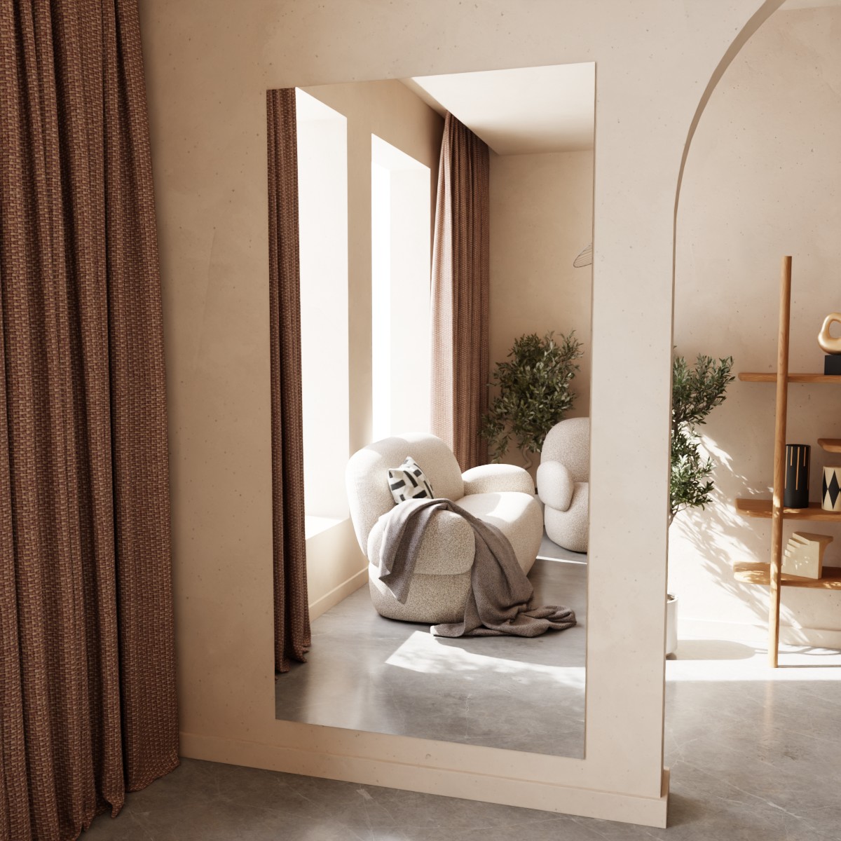 Wanneer je een spiegel neerzet komt er namelijk iets meer druk op het spiegelglas te staan. Als de spiegel te dun is ten opzichte van de oppervlakte, kan het spiegelglas (en daarmee het spiegelbeeld) op den duur licht vervormen. Om dit te voorkomen raden we aan om de onderstaande richtlijnen in acht te nemen: