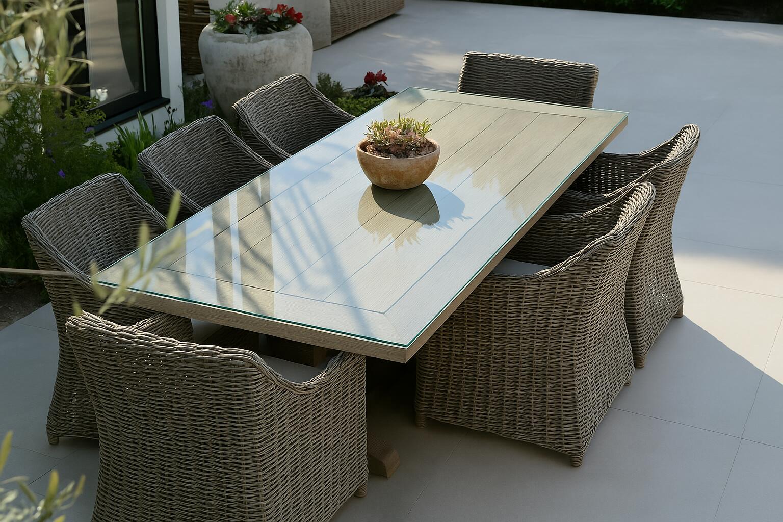 Een dikker tafelblad van 10 mm biedt extra stevigheid en stabiliteit. Deze dikte zorgt ervoor dat het tafelblad goed bestand is tegen de wisselende omstandigheden buiten, zoals wind en temperatuurverschillen. Het maakt het blad ook beter bestand tegen krassen en slijtage, wat belangrijk is Bovendien hebben dikkere tafelbladen een robuuste en luxe uitstraling, wat een mooie toevoeging is aan de stijl van een buitenruimte. Voor kleinere tafels is 8 mm vaak voldoende, waardoor de tafel door het glas niet pompeus wordt.