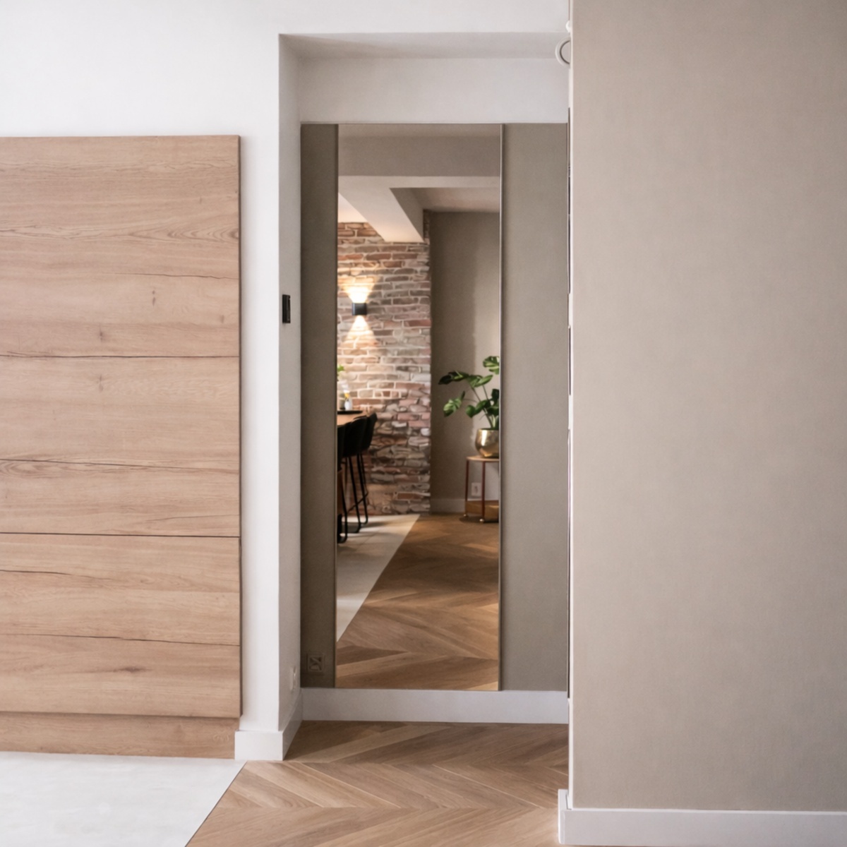 Dankzij de reflecterende eigenschappen en de bronskleurige tint zorgt deze spiegel voor meer diepte en licht in de kamer. Of het nu gaat om een hal, slaapkamer of woonkamer – deze spiegel versterkt het ruimtegevoel en sluit dankzij het minimalistische ontwerp moeiteloos aan bij verschillende interieurstijlen.